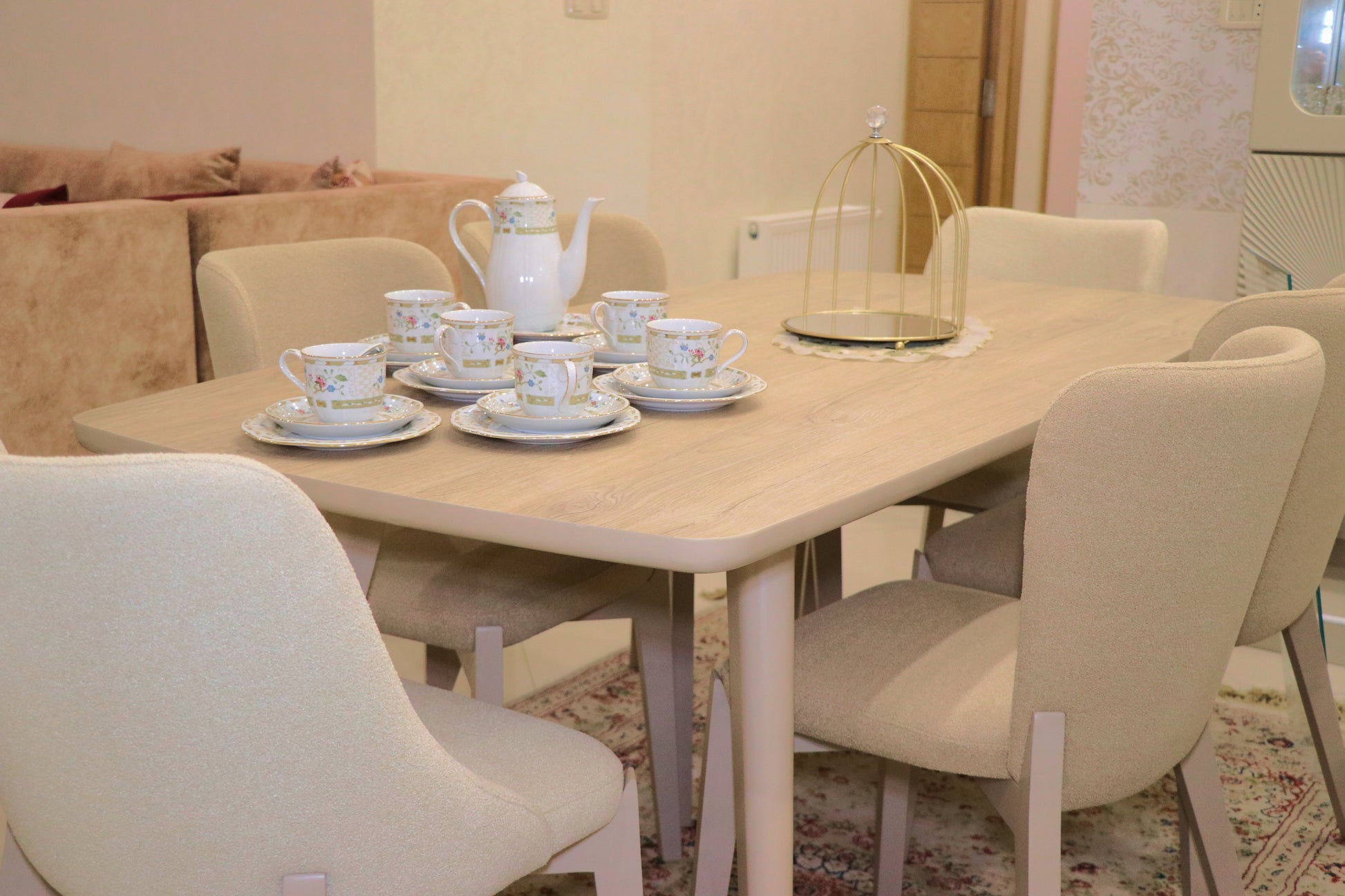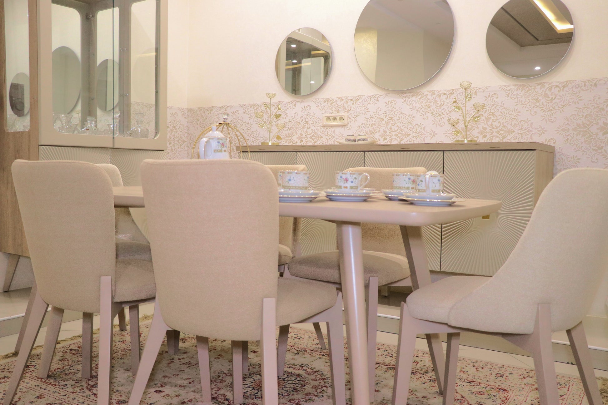 La salle à manger Fiesta comprend un buffet Argentiere élégant accompagné de six chaises revêtues d’un tissu bouclette anti-tache. Ce mobilier allie design raffiné et praticité, offrant une résistance optimale aux éclaboussures et une facilité d’entretien, idéal pour un usage quotidien tout en conservant une esthétique soignée. Parfait pour créer un espace convivial et durable dans votre intérieur.
