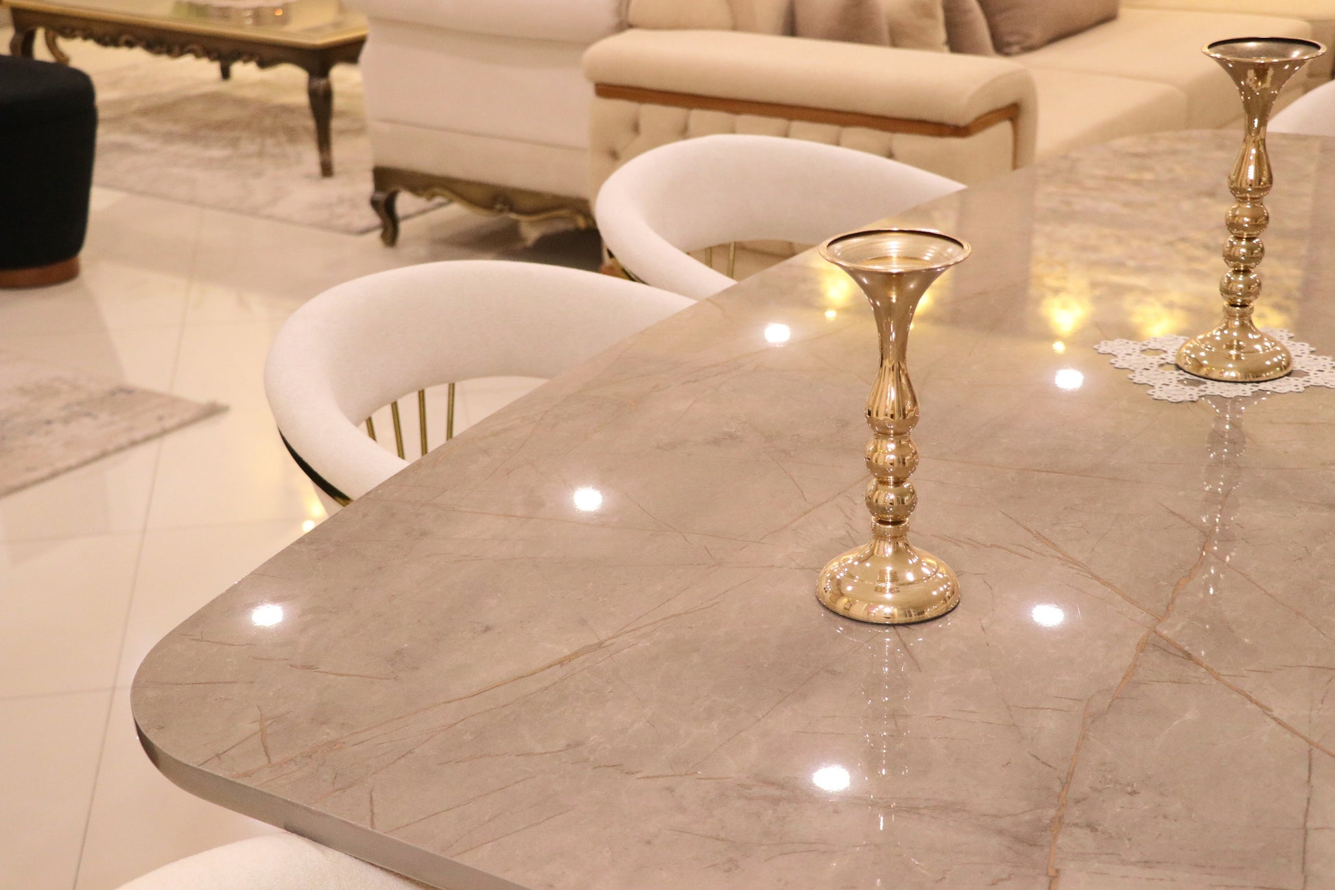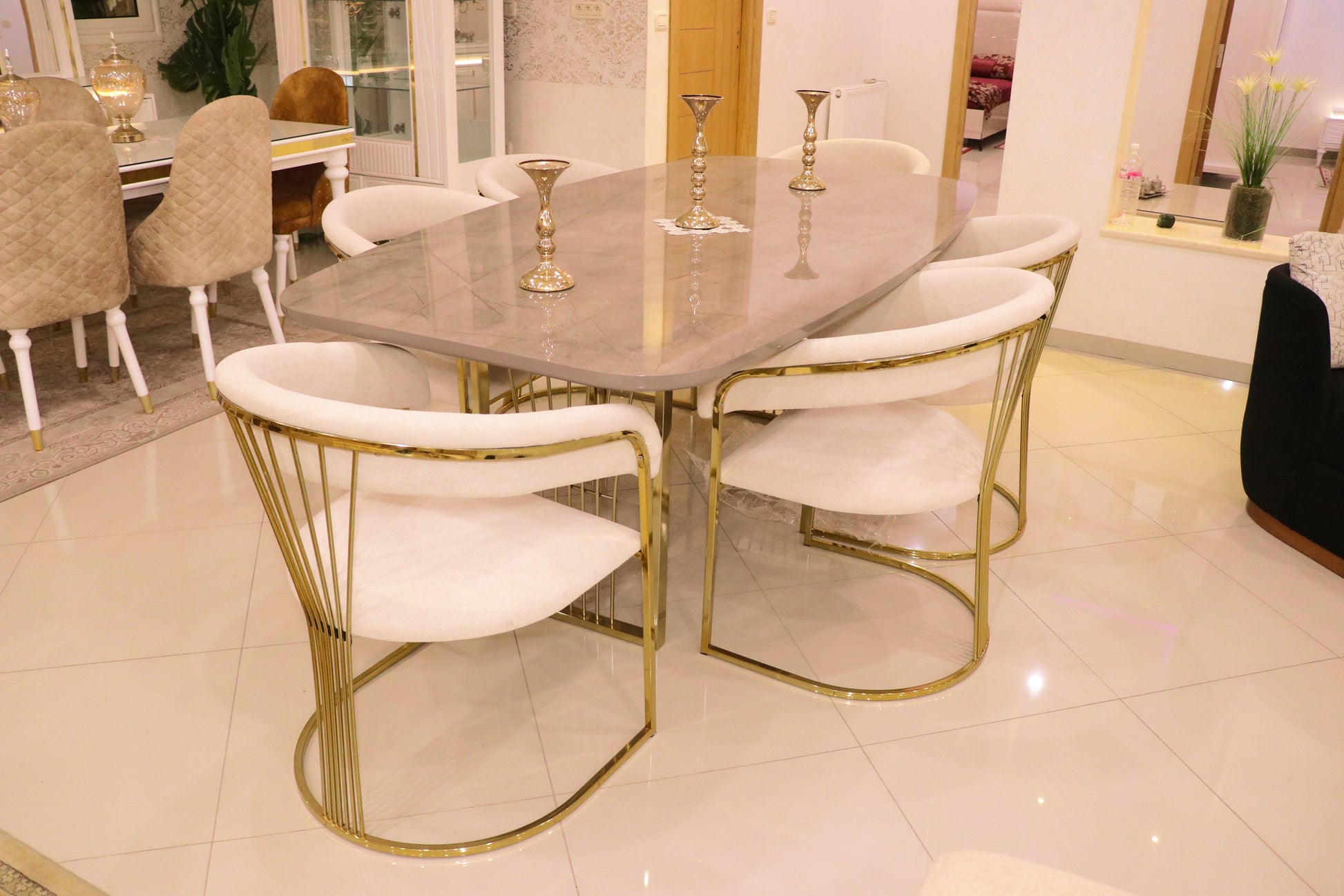 La table à manger Nina allie élégance et fonctionnalité avec son plateau en marbre raffiné et ses chaises en inox doré. Le tissu anti-taches des assises garantit une utilisation durable et facile à entretenir, idéale pour un espace repas sophistiqué et pratique.